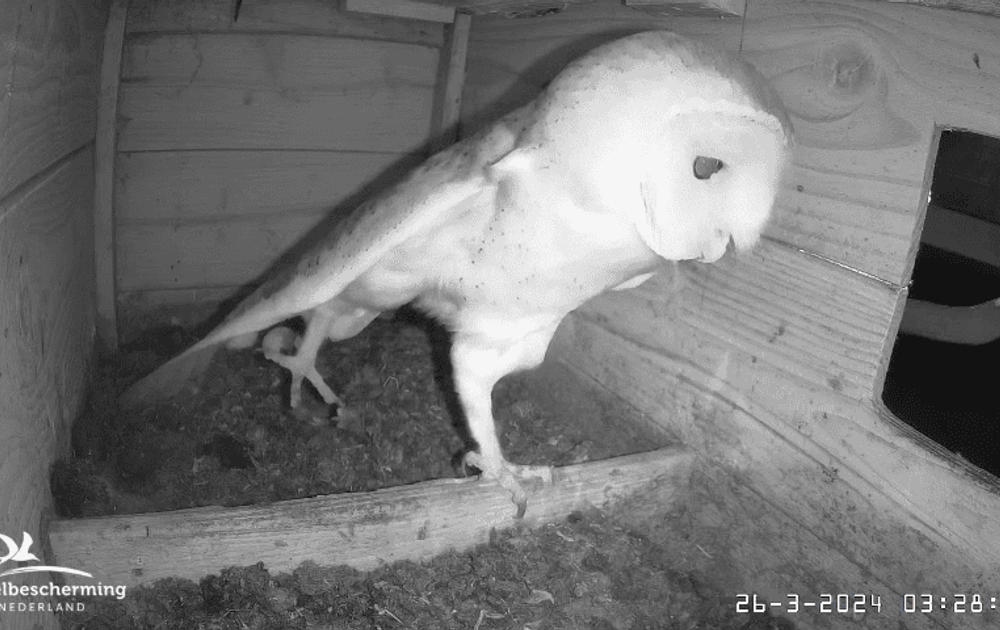 Bijna een halfuur was er vannacht een floater (uil zonder territorium) op bezoek, maar V bleef opmerkelijk rustig en ging gewoon door met haar nachtelijke werkzaamheden.