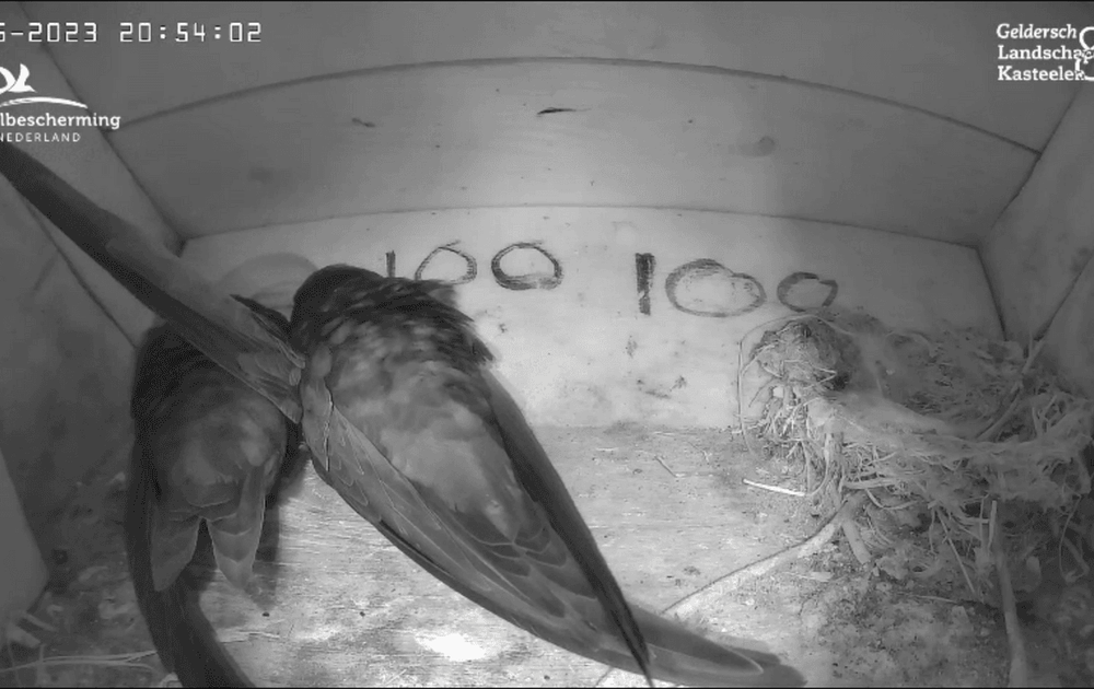 Het koppeltje gierzwaluwen zat gezellig samen bij het invlieggat terug te roepen naar de voorbijvliegende soortgenoten.