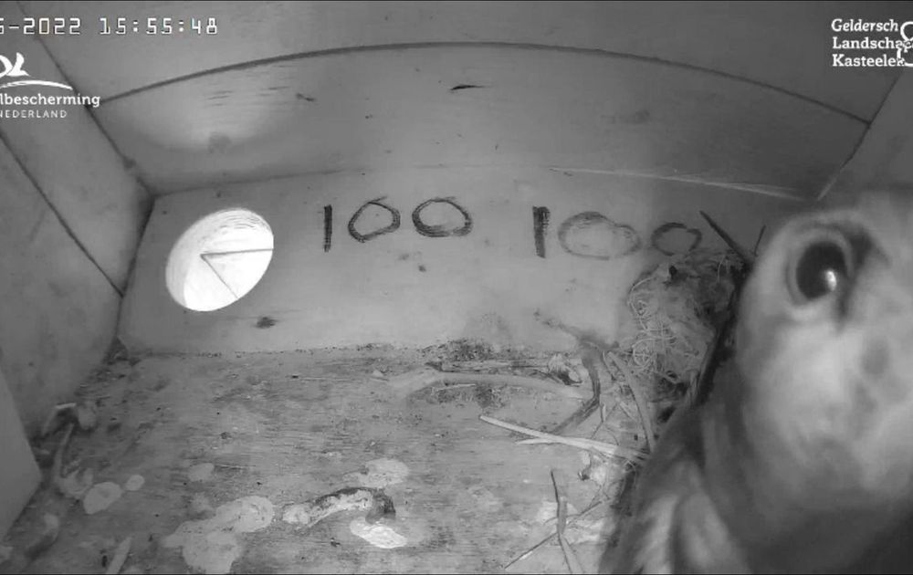 Eindelijk is het moment gekomen! De eerste gierzwaluw van het paartje in onze nestkast is gearriveerd.