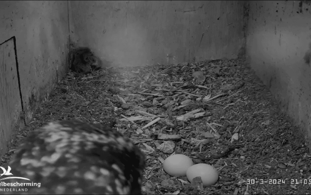 Vrouw steenuil legde haar derde ei. Opvallend was dat ze tokkelend ging zitten in de leghouding. De plofjes, die gepaard gaan met het leggen van een ei, waren erg duidelijk te horen, er was geen storend omgevingsgeluid.