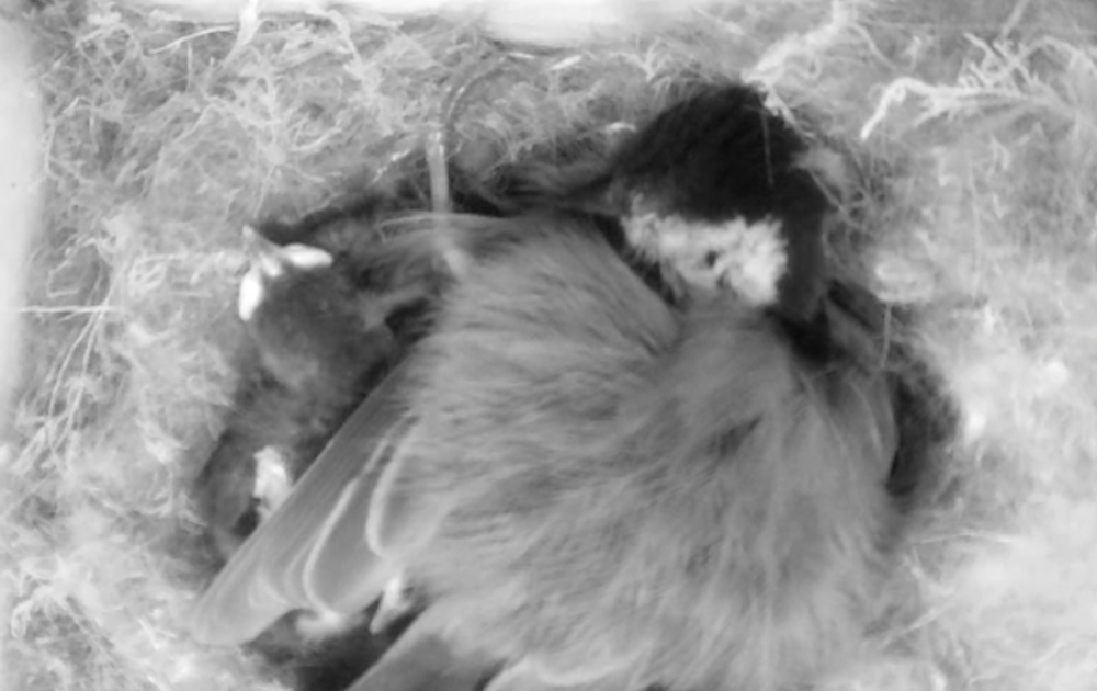 De kleine koolmeesjes groeien ontzettend hard. En de opengesperde snaveltjes zijn ook niet meer geluidloos, er komt een hoop gepiep uit. Behalve als ze gaan slapen, dan gaan de oogjes en snaveltjes toe en kruipen ze fijn dicht tegen ma koolmees aan.