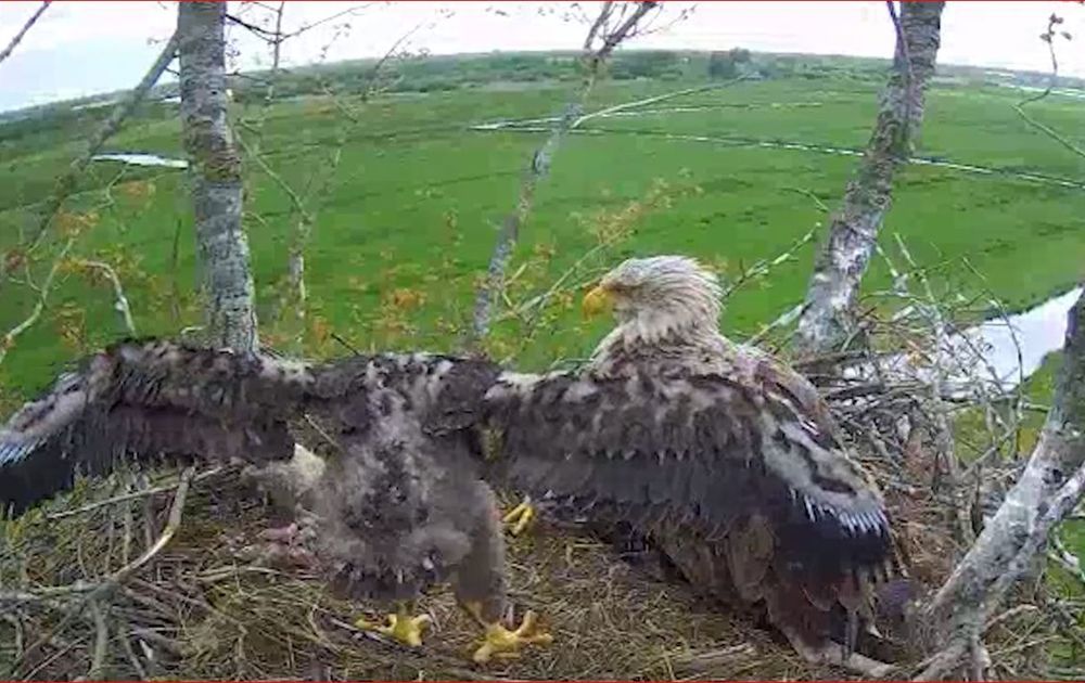 En kijk nu eens: ze zijn enorm! Vijf-en-een-halve week oud zien we nu eens slome slapers, dan weer vlugge vleugelflappers. Als luie èn vlotte pubers zijn ze zeer aanwezig op het nest. De vleugeloefeningen zijn echt begonnen en ze mogen ook al graag zelf wat van een prooi afscheuren.