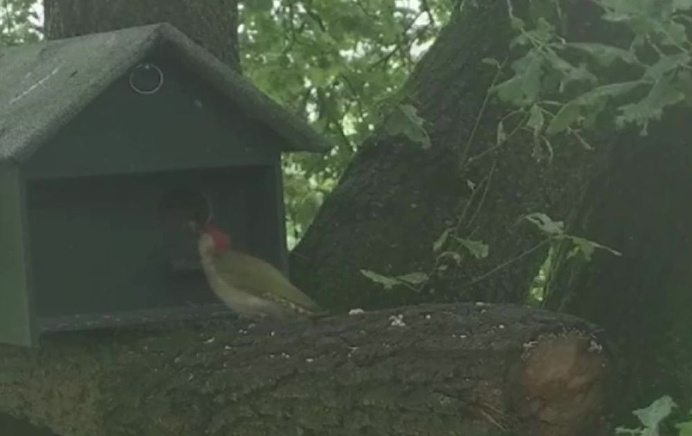 Na twee seizoenen alleen het geluid op de camera gehoord te hebben, eindelijk een groene specht in beeld op de steenuilcamera.