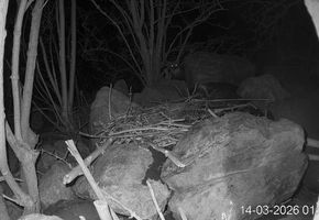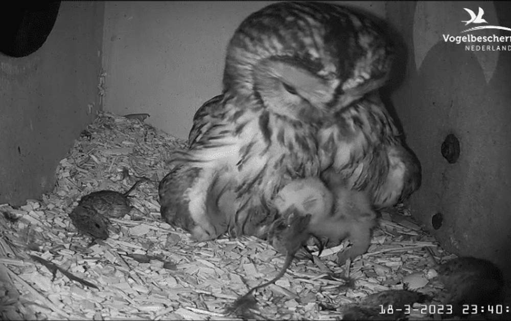 In de nacht van zaterdag op zondag was te zien dat het kuiken een groot stuk muis kreeg aangeboden. Dat doet vrouw bosuil steeds vaker, want het kuiken groeit hard en kan steeds meer 'verwerken'.