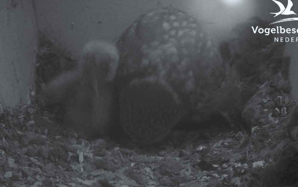 Vrouw steenuil voert de kuikens. Eén kuiken weet een heel staartstuk naar binnen te werken.
