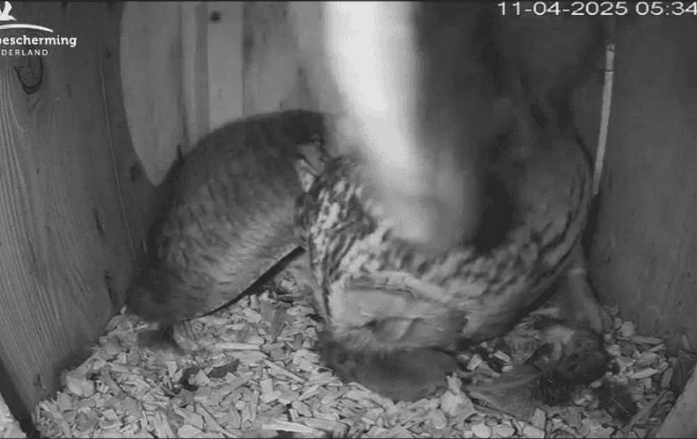 ...maar eerst het geluid van een prooioverdracht vlak bij de kast, waarna vrouw bosuil een muis binnen brengt.