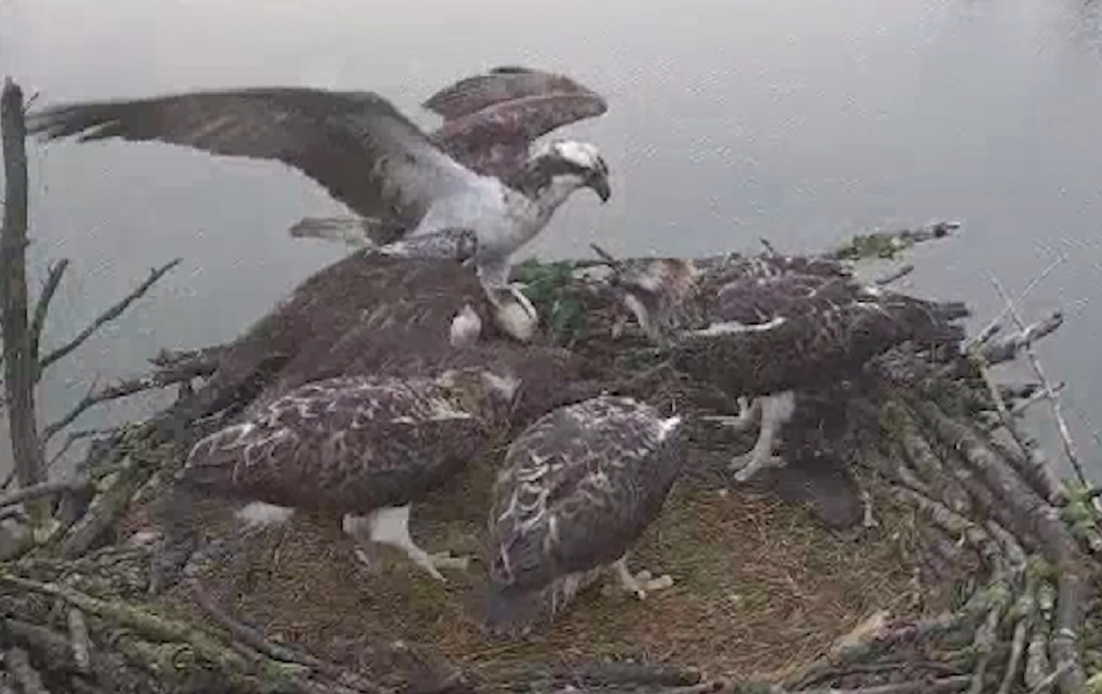 Prooien komen in alle maten. De kleinste vissen mogen de jonge visarenden al zelf afhandelen maar de grotere worden nog gevoerd.