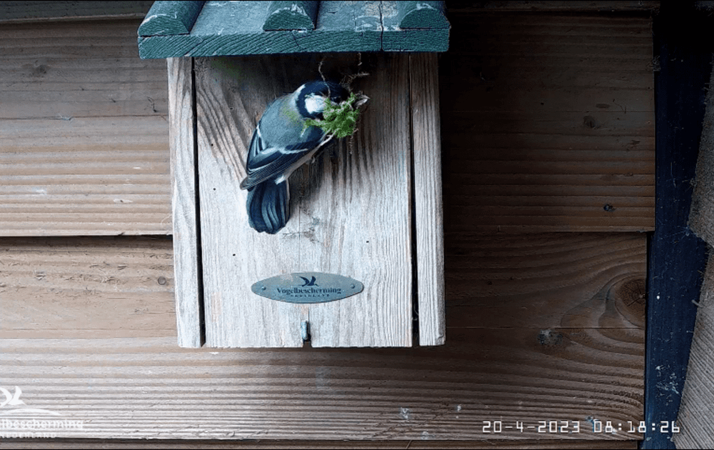 Vrouw koolmees bouwt in rap tempo door. Soms is de lading bijna te groot, soms krijgt ze wat mos op haar hoofd, maar ze is onvermoeibaar. Let op de tijd: soms zit er maar 40 seconden tussen het vertrek en de volgende aankomst!