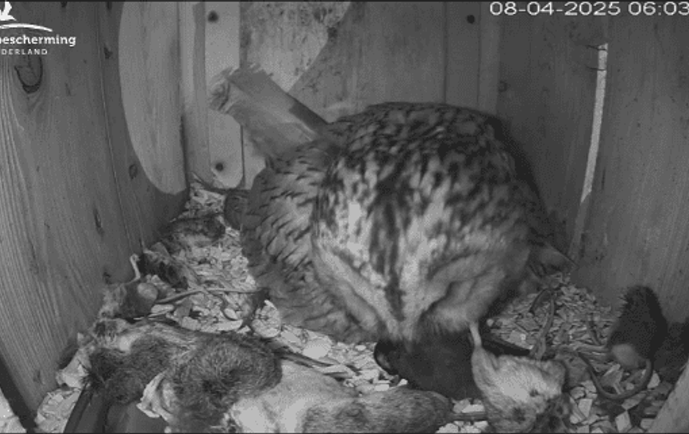 Zo te zien zijn het vooral de veertjes die in de snaveltjes verdwijnen. Wat kunnen die kleintjes al veel verwerken aan wat ze in de bek gestopt krijgen. Twee en een half uur later wordt de koolmees helemaal 'verwerkt'. Dan verdwijnen grote stukken 'mees' in de snaveltjes.