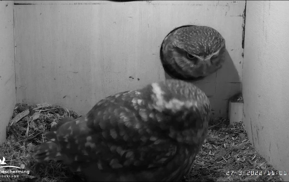 Een kauw drijft vrouw steenuil de nestkast in, ondanks snavelklakken. Man steenuil vindt dat niet erg: een paar scenes uit wat volgt.