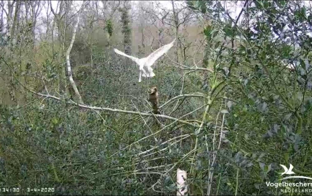 Vermoedelijk zit er in het linkernest (bij de lange smalle liggende berk) al een Lepelaar te broeden. De Partner lijkt vanmiddag het heen en weer te hebben.