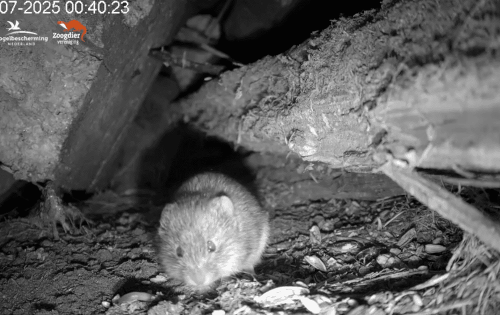 Hebben we tot nu toe 's nachts vooral de bosmuis voor de camera gehad, nu is juist midden in de nacht de woelmuis te zien. Al heeft het beestje wel een beetje het heen en weer...