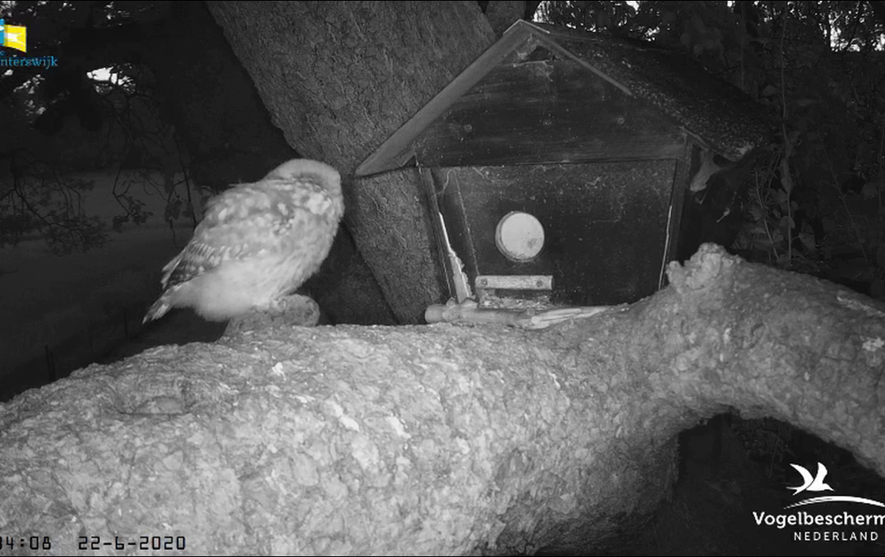 De jonge steenuilen rennen heen en weer met de muizen. Van de kast naar een traditionele bewaarplaats links buiten beeld op de tak.