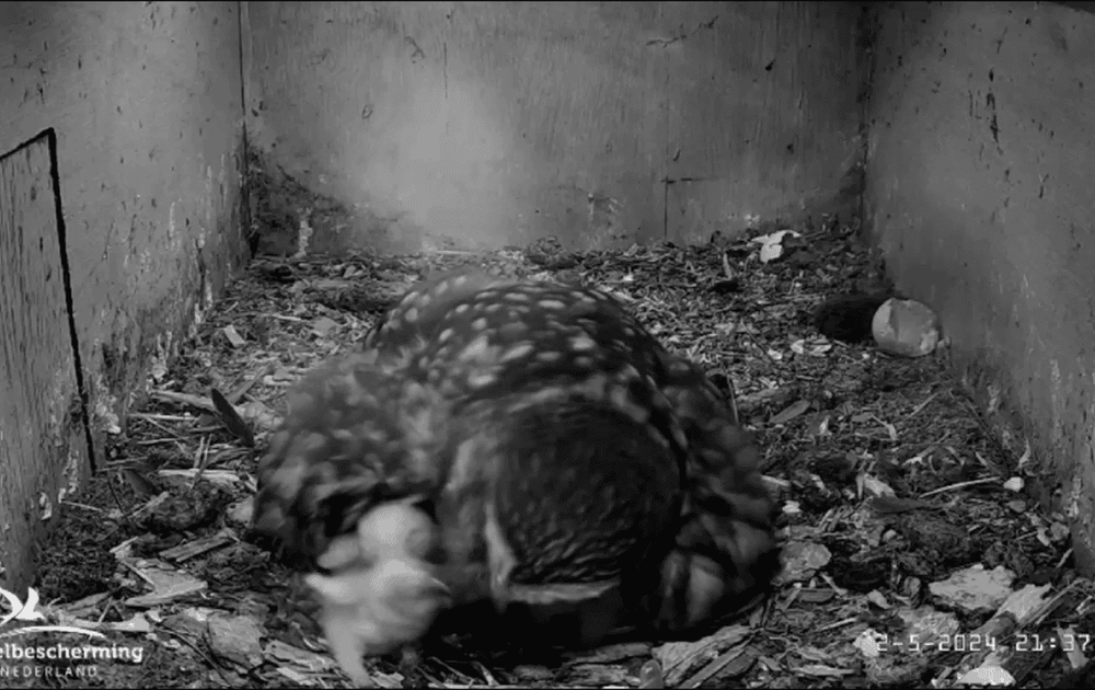 Het loopt goed af! Een kuiken valt om na het krijgen van een brok eten, dat verkeerd valt? Vrouw steenuil raakt in lichte paniek en gaat het kuiken reanimeren door te stimuleren met de snavel. prikken en trekken. Uiteindelijk komt het kuiken weer in beweging.