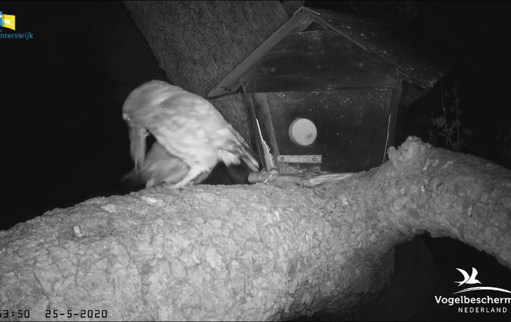 Het linksgeringde kuiken slikt snel snel de hele muis in als vrouw steenuil probeert in te grijpen.