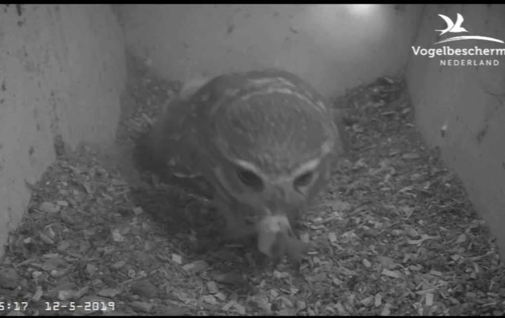 Man steenuil wil een meikever voeren aan de kuikens, het lukt niet. Hij weet niet hoe hij moet aandringen en de kuikens zijn al vol meikevers.