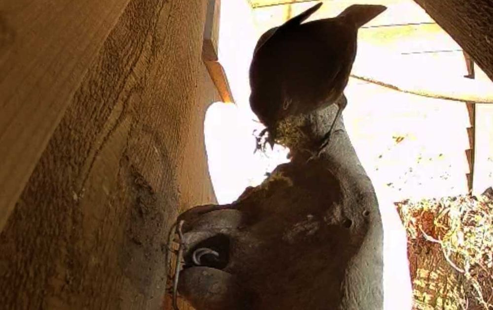 En zie daar om 9:36 uur Vrouw Merel met nestmateriaal,