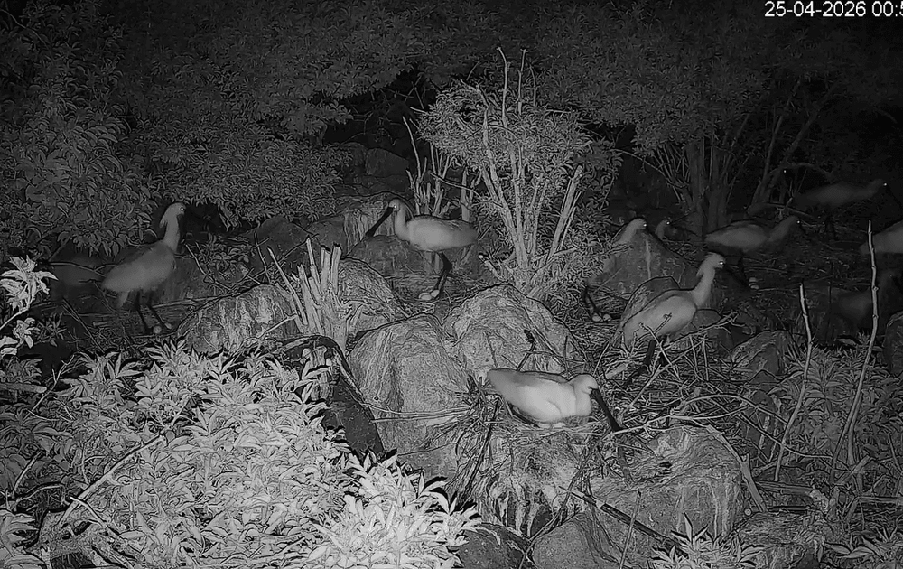 Dat veranderde in de nacht van 24 op 25 april. Nadat de boommarter weer voor onrust had gezorgt en de nesten weer leeg achterbleven, zagen we de lepelaars al na 30 minuten terugkeren naar hun nest.