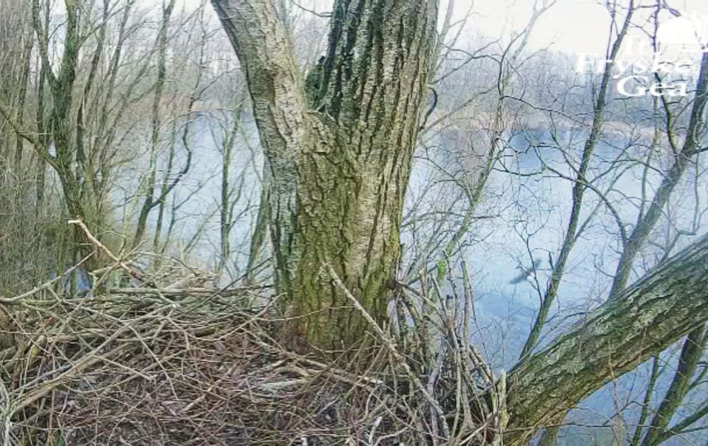 Het zal de meeste kijkers ontgaan zijn, maar het zeearend mannetje heeft zijn debuut gemaakt door op de achtergrond voorbij te vliegen en een poosje op een tak te gaan zitten.