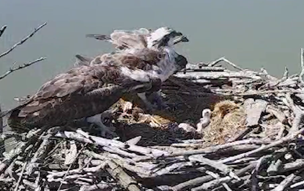Het eerste ei is uitgekomen bij de visarenden! De net geboren visarend wordt gelijk verwend met een eerste maaltijd. Binnen een week zullen er uit de andere twee eieren ook kuikens kruipen.