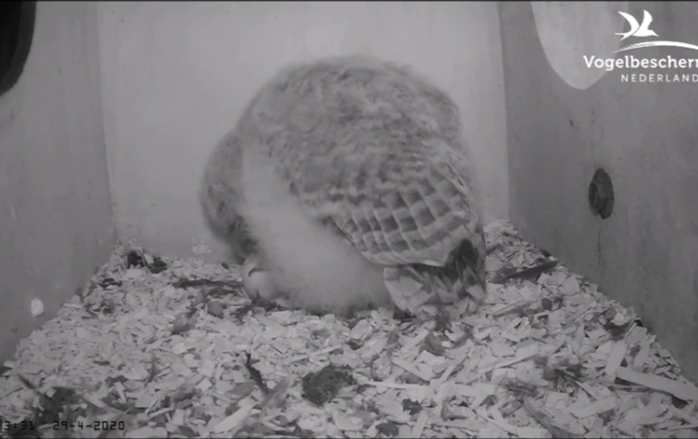 Vroeg in de ochtend is het kuiken heel actief en een beetje rellerig zelfs. Allerlei schijnaanvallen volgen elkaar op. Ook op het ei. Als je goed kijks zie je dat het ei flink onder handen wordt genomen (bewegen en zelfs even omhoog). Het ei lijkt te worden aangepikt en dat er vocht uit loopt. In de loop der dag kleven er vuil en veertjes aan het ei en komen er vliegen op af.