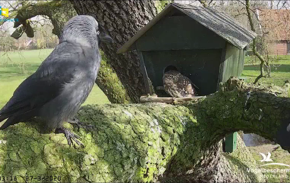 Man steenuil vertjaagt steeds weer terugkerende kauwtjes.