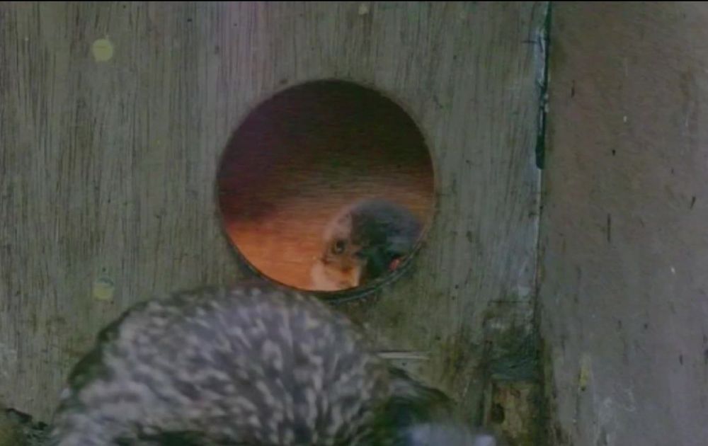 Het ene kuiken is nog steeds in de sluis (het voorportaal) van de nestkast.