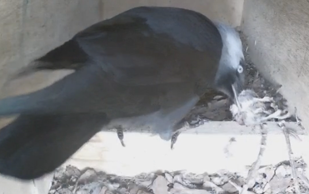 De kauwtjes zijn druk bezig hun nieuwe huis in te richten en komen ook een dode muis tegen, een dode muis?