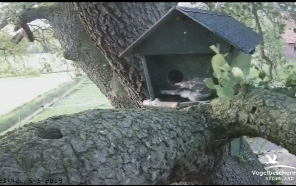 Man steenuil legt een grote woelmuis rechts onder de drempel bij de nestkast. Vrouw haalt de muis een kwartier later op en bewaart de woelmuis in de nestkast.