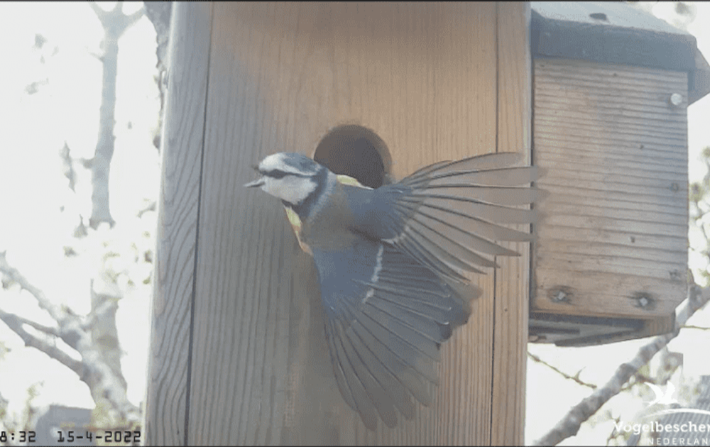 Een bijzonder bezoek. Even is een bonte vliegenvanger voor het vlieggat.