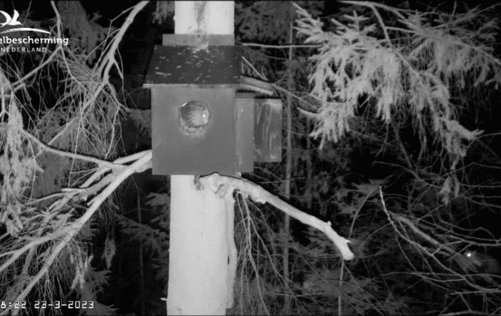Weer die marter. In tegenstelling tot 6 maart, toen vloog vrouw bosuil weg om de marters te foppen (doen meerdere vogels als er een rover in de buurt is van een nest), blijft ze op haar post.