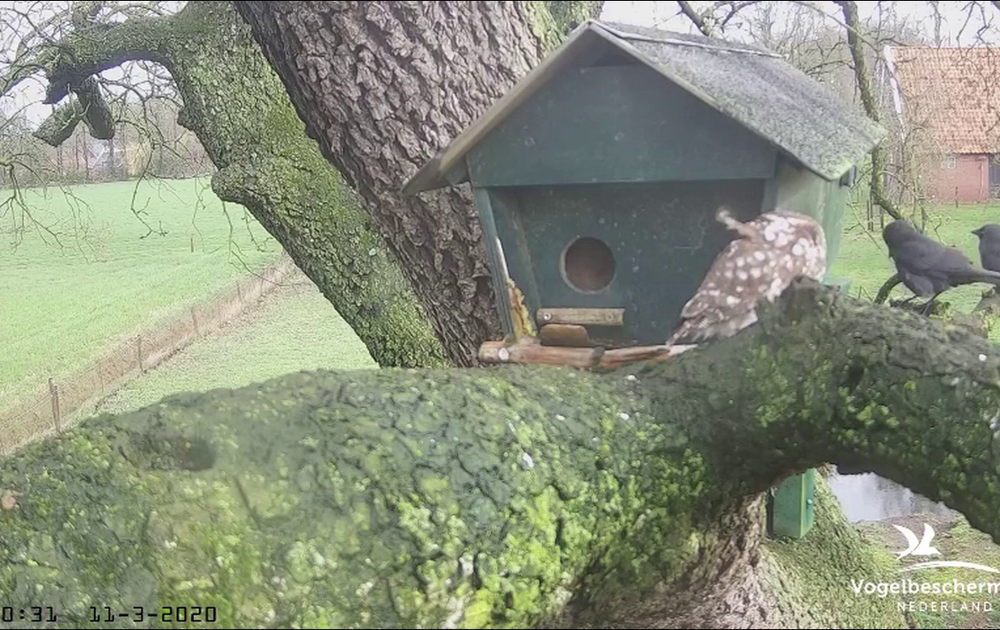 Kauwtjes komen "spelen" bij de nestkast van de steenuilen. Man bewaakt het fort.