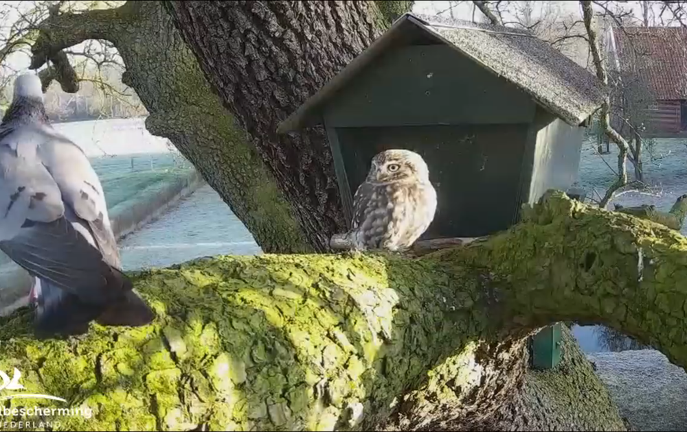 Man steenuil is druk bij de nestkast met het wegjagen van ongenode bezoekers. Bij de eerste, een holenduif, lukt dat nog niet zo. Maar de kauwtjes begrijpen beter wat de bedoeling is. Vrouw steenuil zit ondertussen rustig in de nestkast. Maar het gekrijs van de een kauw verontrust haar. Ze gaat kijken en gelukkig verschijnt man ongeschonden op de tak.