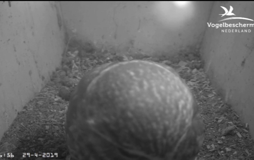 Man steenuil komt rusten voor de nestkast. Vrouw doet luidkeels haar best om hem duidelijk te maken dat voedsel nu zijn belangrijkste activiteit zou moeten zijn.
