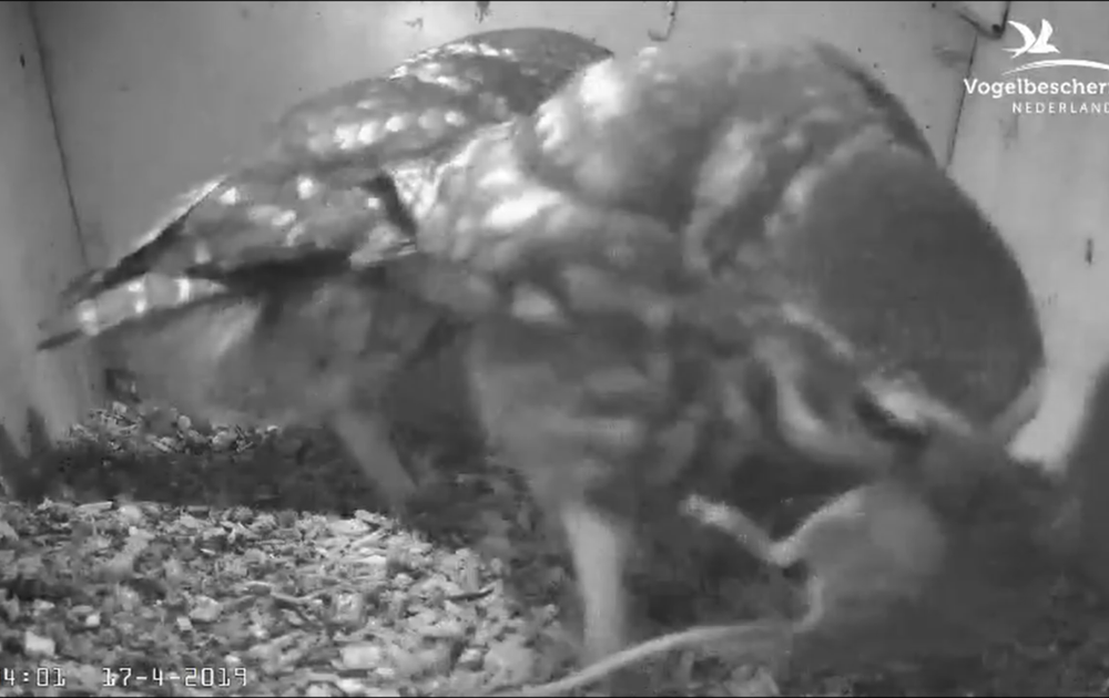 Man steenuil komt graag overdag in de nestkast bij broedende vrouw steenuil, zeker als er een muis op voorraad ligt. Bij de 5e poging (1 poging in beeld) laat vrouw hem een stuk muis eten.