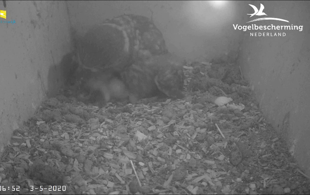 Vrouw steenuil voert rustig een muis aan de kuikens. Die muis was twee en een halfuur hiervoor gebracht.