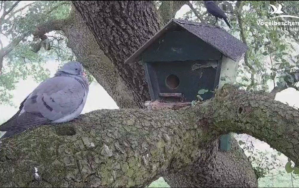 Opmerkelijk dat de duif meer dan een half uur kan blijven zitten. Ondertussen komt ook nog ven een kauw op het nestkastdak.