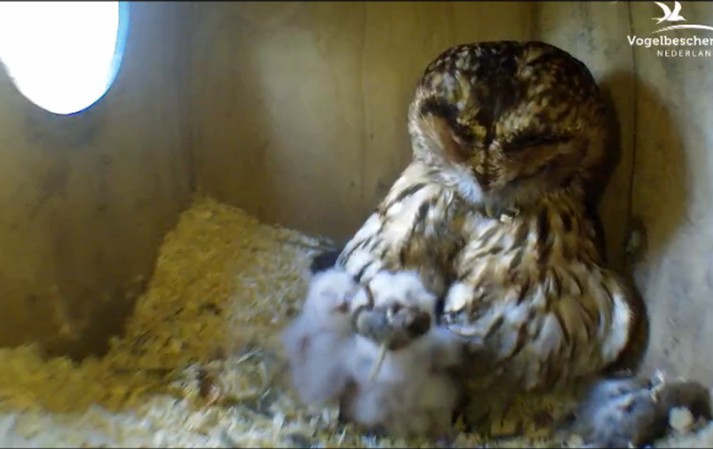 Bij de bosuil groeien de kuikens al flink. Het eerste kuiken is nu zeven dagen oud. Het laat ons hier eens goed zien hoe je grote stukken prooi opslokt. Een staaltje stoer eten toch?! Het kuiken deed het al eerder deze dag, maar de stukken prooi worden steeds groter. De pootjes en de staart van de muis hangen bij het doorslikken zelfs nog uit zijn snavel. Kuiken nummer één wordt al echt een Hollebollegijs.