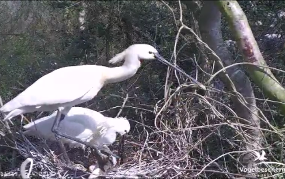 Bij de berkcam onder het voorste nest wordt druk gebouwd/verbouwd, en ja, waar gehakt wordt vallen spaanders....
