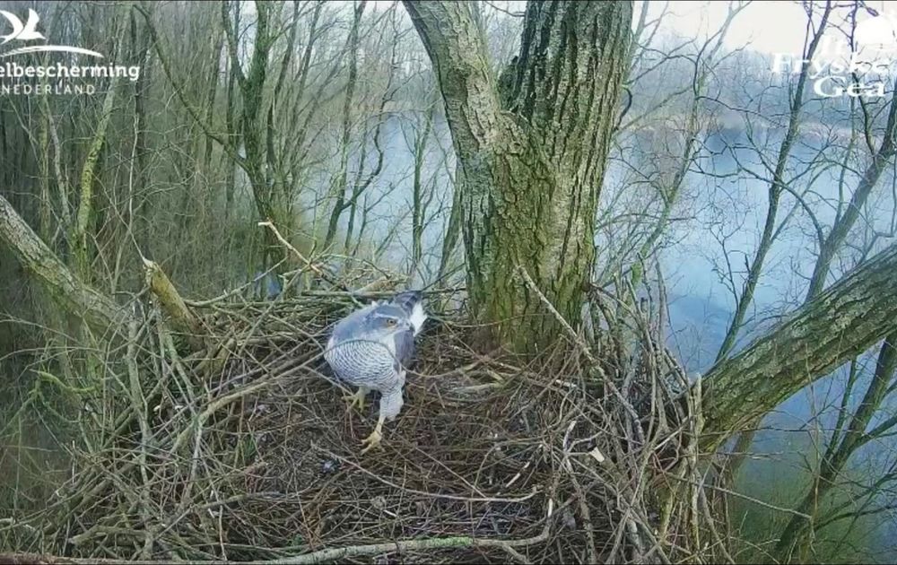 Terwijl de zon langzaam opkomt, laat de webcam hoopvolle dingen zien in het nest! Eerst komt het havik mannetje het nest voor het eerst inspecteren. Je hoort hem duidelijk communiceren met het vrouwtje, die na hem het nest op orde maakt. Zullen de haviken gaan broeden in dit zeearendnest?