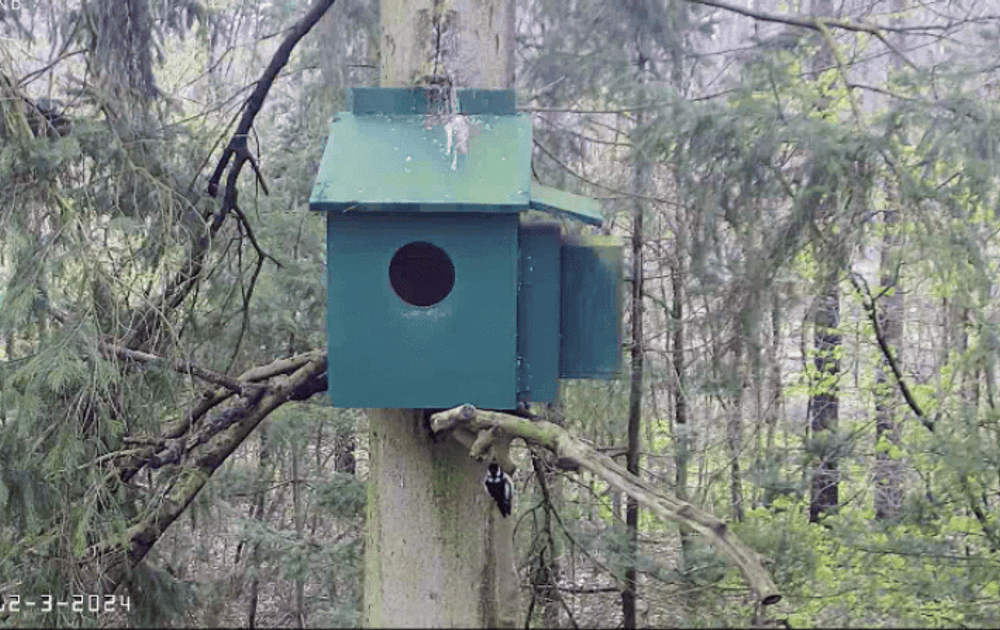 Even voor het middaguur was een nieuwe 'buitengast' hoorbaar en zichtbaar: Een grote bonte specht(v). Zelfs via de buitencamera goed hoorbaar!