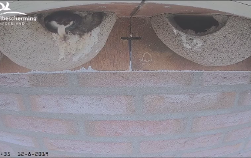 De nestkom wordt zoveel mogelijk schoongehouden door de poepzakjes naar buiten te gooien. Er werd weer flink gevoerd vandaag, en dan is het na zo'n dag goed rusten met het hele gezin