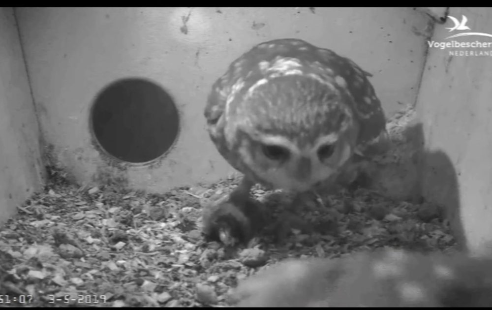 Man steenuil mag niet te veel aan de muizenvoorraad komen. Hij probeert nu te helpen bij een voedering van de kuikens, totdat vrouw er genoeg van heeft.