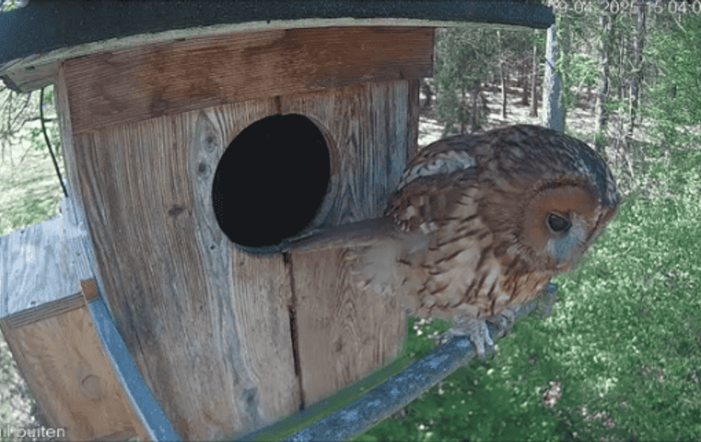 ....nou ja, even dan. Al dat geduw en dat gesnavel aan je verenkleed is vrouw bosuil -zo lijkt het- eventjes wat te veel. Uren in het vlieggat zitten en dan even een uitstapje helemaal naar buiten en genieten van het mooie weer.