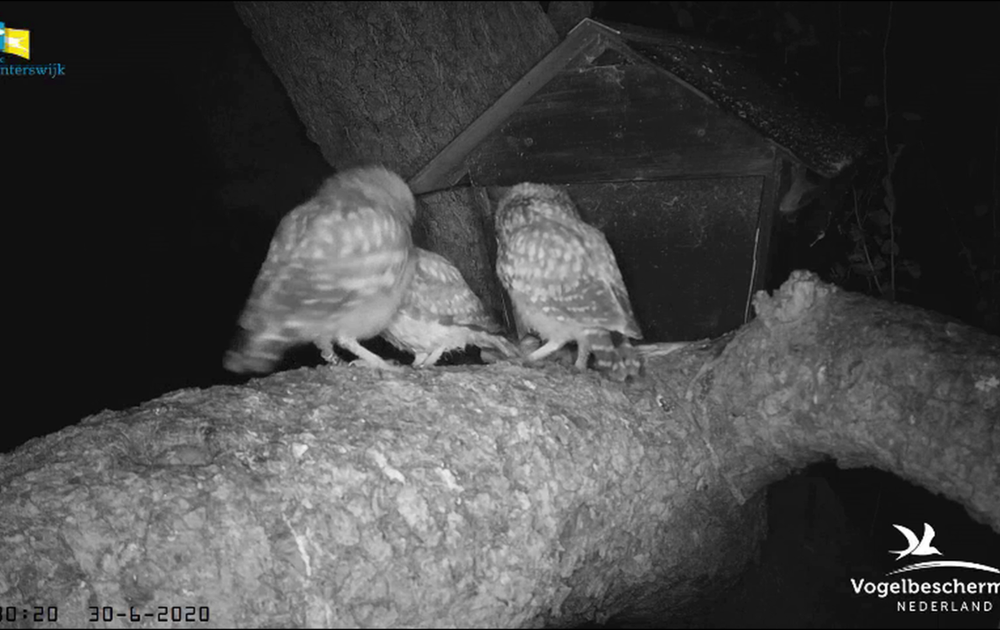 Vrouw steenuil met gevolg van hongerige jongen onderweg in de nacht op zoek naar voedsel.