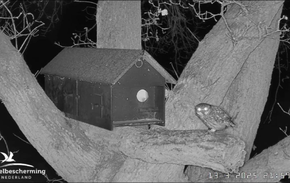 Op 13 maart: een steenuil in beeld als het donker is, 11x in de vroege morgen en late avond. Man voert regelmatig kleine prooien aan. Hij eet ze soms zelf op of is zoekend waar Vrouw is.