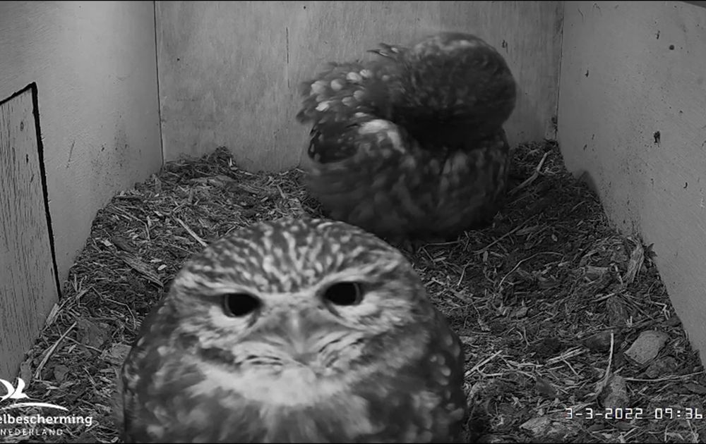 Als de steenuilen nu overdag in de nestkast zijn, slapen ze vooral. Maar soms is er wat anders te beleven.