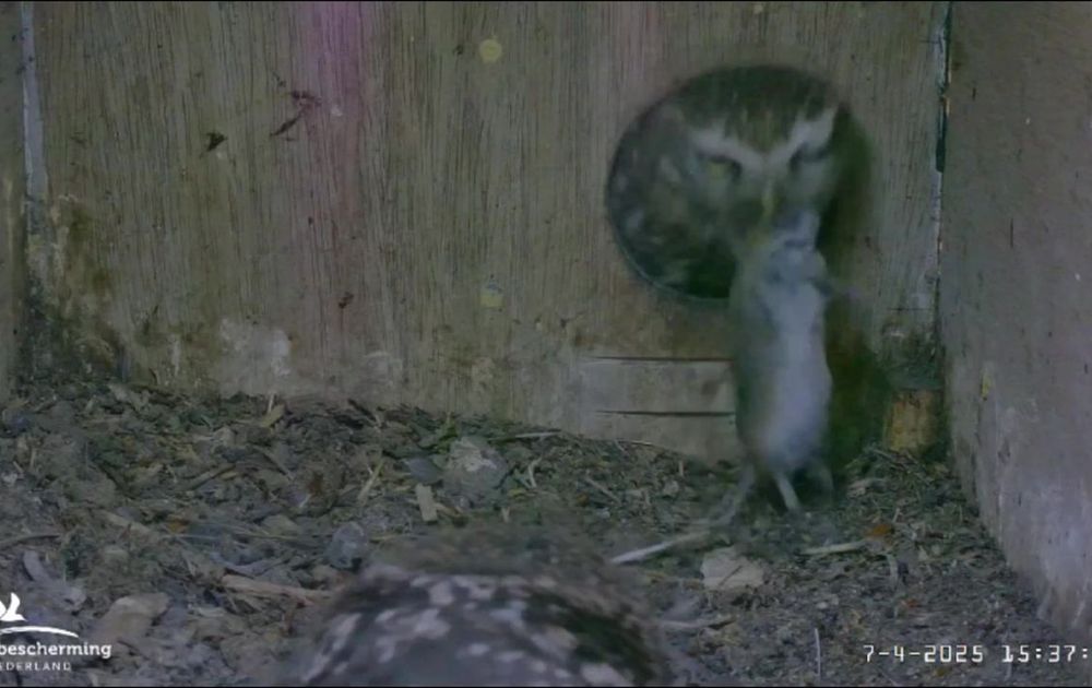 Overdag een muis dat is zeldzaam voor de vooral nachtactieve steenuil. Man steenuil kan niet gemakkelijk afstand van doen van de woelmuis, maar Vrouw roept te dwingend.