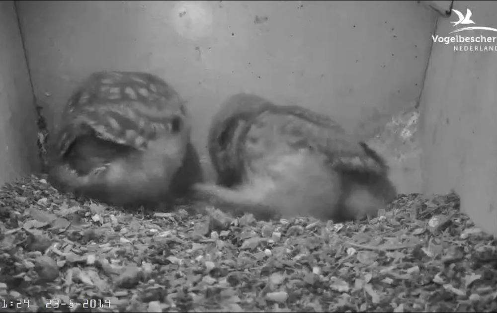 Een kuiken wentelt zich lekker in de stoffige vloerbedekking. Man steenuil komt een kever brengen.