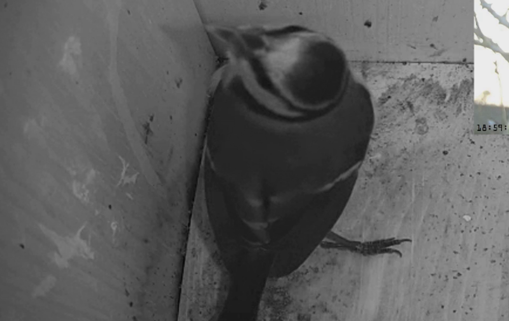 Vrijdag 18 maart was er ’s avonds een hoop activiteit bij de kast: een indringer! Een andere pimpelmees kwam een kijkje nemen, iets waar de pimpelmees in de kast niet blij mee was. Wat volgde was gefladder en geblaas van beide mezen, steeds als de rivaal langs kwam. De verdedigende mees maakte zelfs pikbewegingen naar de ander. Uiteindelijk keerde de rust terug en verdween de overwinnaar naar het veilige plekje onder de cam.